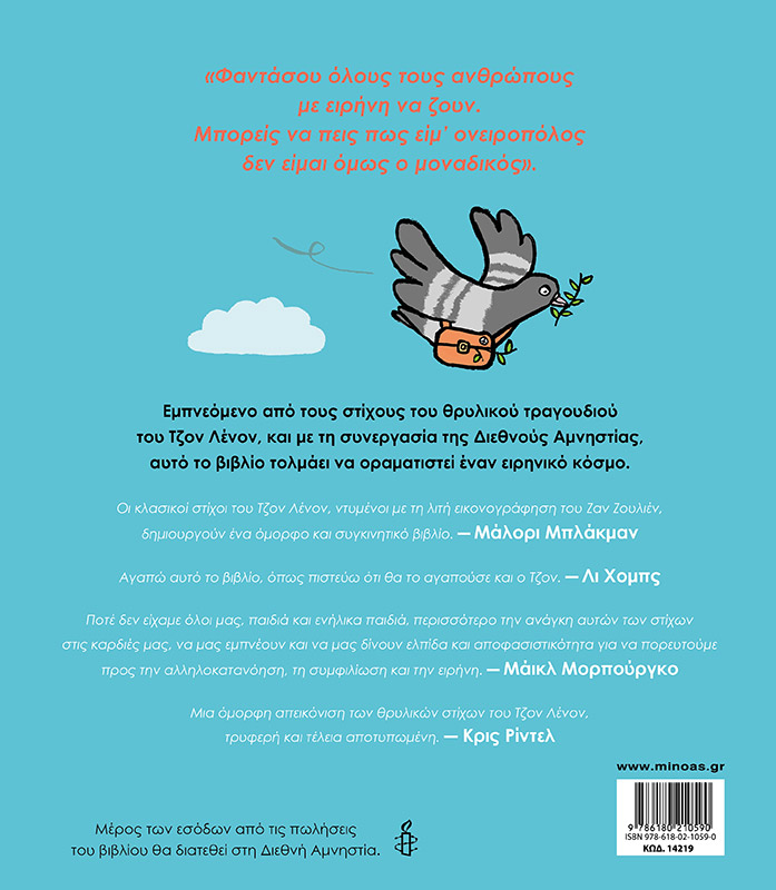 Ένα βιβλίο εμπνευσμένο από τους στίχους του θρυλικού τραγουδιού του Τζον Λένον, με τη συνεργασία της Διεθνούς Αμνηστίας, που τολμά να οραματιστεί έναν ειρηνικό κόσμο…